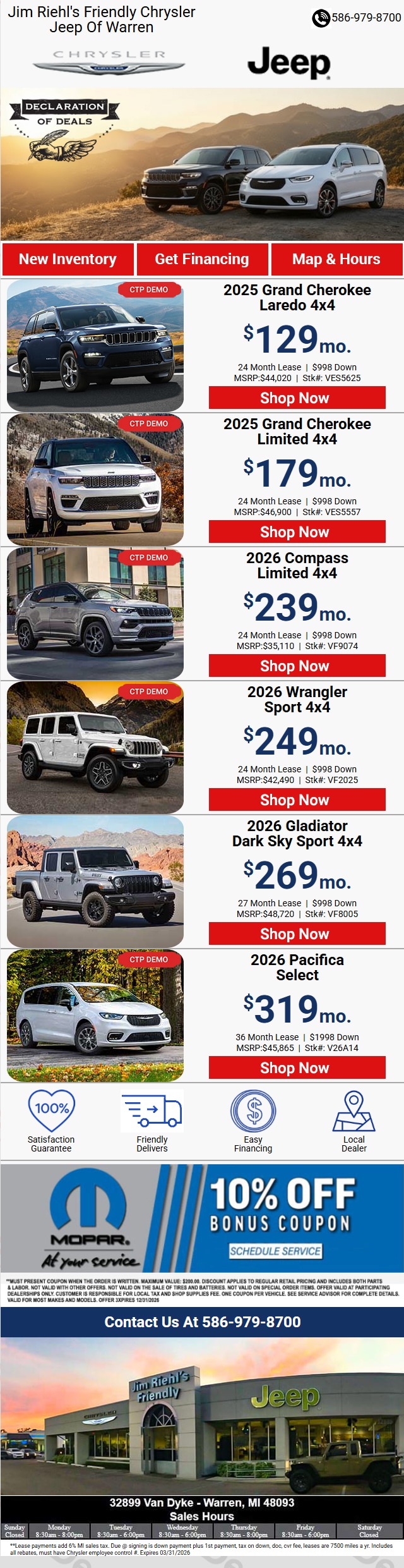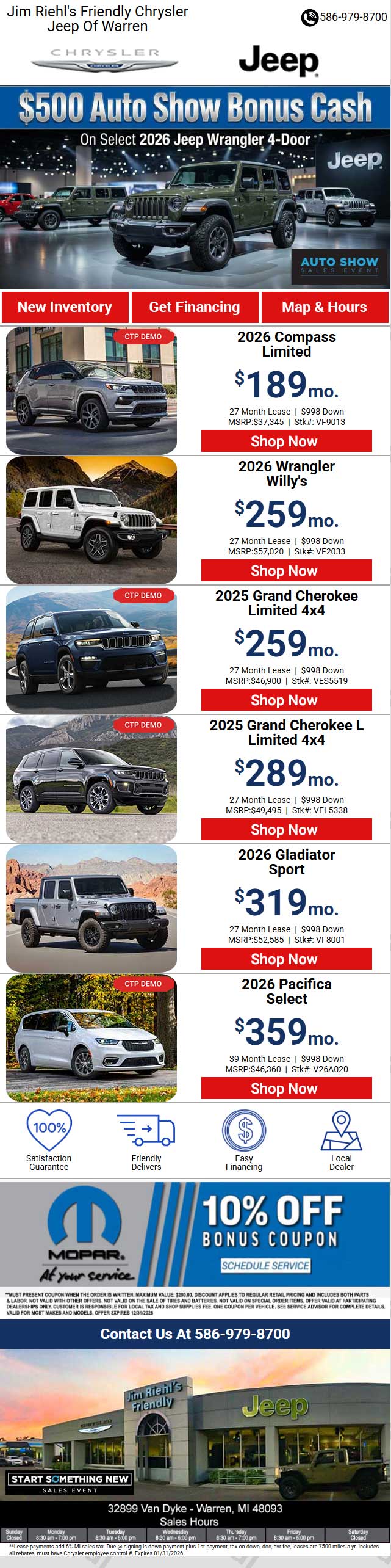 This page is your direct link to the most competitive discounts, lease offers, and special financing incentives available right now at Jim Riehl's Friendly Chrysler Jeep. Serving drivers from Warren to Sterling Heights and Detroit, we are dedicated to providing clear, transparent deals on our entire inventory. You'll immediately see why we emphasize Market Value Pricing-our system ensures we compare our prices to similar vehicles in the area, guaranteeing you the best deal without the worry of haggling. Whether you are looking for a brand-new Jeep SUV, a family-friendly Chrysler, or an affordable used truck, our "Current Advertised Specials" are hand-picked for maximum savings.