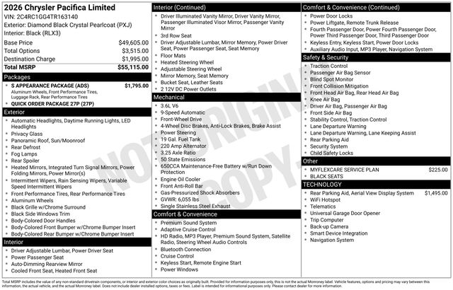 Check out all the standard equipment Quick Order Package 27P, S Appearance Package (Anodized Ink Badging, Black Day Light Opening Moldings, Black Stow 'N Place Roof Rack, Gloss Black Exterior Mirrors, Premium Rear Fascia Black, S Badge, and Wheels: 20" x 7.5" S-Model Aluminum Design 1), Safety Sphere (360 Surround View Camera System), 13 Speakers, 18" x 7.5" Painted Aluminum Wheels, 3.25 Axle Ratio, 3rd row seats: split-bench, 4-Wheel Disc Brakes, ABS brakes, Air Conditioning, Alloy wheels, AM/FM radio: SiriusXM 360L, Apple CarPlay/Android Auto, Audio memory, Auto-dimming Rear-View mirror, Automatic temperature control, Black Seats, Brake assist, Bumpers: body-color, Compass, Delay-off headlights, Driver door bin, Driver vanity mirror, Driver's Seat Mounted Armrest, Dual front impact airbags, Dual front side impact airbags, Electronic Stability Control, Emergency communication system: Chrysler Connect, Four wheel independent suspension, Front anti-roll bar, Front Bucket Seats, Front dual zone A/C, Front fog lights, Front reading lights, Fully automatic headlights, Garage door transmitter, Heated door mirrors, Heated front seats, Heated rear seats, Heated steering wheel, Illuminated entry, Integrated Active Noise Cancellation, Knee airbag, Low tire pressure warning, Memory seat, MyFlexCare Service Plan, Nappa Leather Bucket Seats, Navigation System, Occupant sensing airbag, Outside temperature display, Overhead airbag, Overhead console, Panic alarm, ParkView Rear Back-Up Camera, Passenger door bin, Passenger seat mounted armrest, Passenger vanity mirror, Power door mirrors, Power driver seat, Power Liftgate, Power moonroof, Power passenger seat, Power steering, Power windows, Radio data system, Rain sensing wipers, Rear air conditioning, Rear reading lights, Rear window defroster, Rear window wiper, Reclining 3rd row seat, Remote keyless entry, Security system, Speed control, Split folding rear seat, Spoiler, Steering wheel mounted audio controls, Tachometer, Telescoping steering wheel, Tilt steering wheel, Touring Suspension, Traction control, Trip computer, Turn signal indicator mirrors, Variably intermittent wipers, Ventilated front seats, and Voltmeter. Price includes: $3500 - 2026 National Retail Bonus Cash . Exp. 04/30/2026