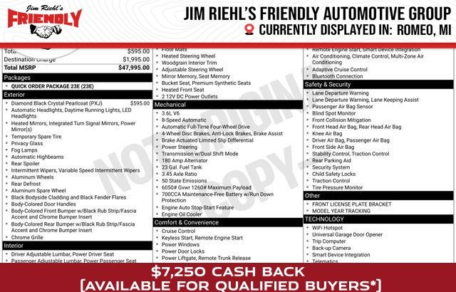 Check out all the standard equipment Quick Order Package 23E, 4WD, 4-Wheel Disc Brakes, 6 Speakers, ABS brakes, Active Noise Control System, Air Conditioning, Alloy wheels, AM/FM radio: SiriusXM with 360L, Anti-whiplash front head restraints, Audio memory, Auto High-beam Headlights, Automatic temperature control, Brake assist, Bumpers: body-color, Capri Leatherette Seats, Compass, Delay-off headlights, Driver door bin, Driver vanity mirror, Dual front impact airbags, Dual front side impact airbags, Electronic Stability Control, Emergency communication system, Four wheel independent suspension, Front anti-roll bar, Front Bucket Seats, Front Center Armrest w/Storage, Front dual zone A/C, Front fog lights, Front License Plate Bracket, Front reading lights, Fully automatic headlights, Garage door transmitter, Heated door mirrors, Heated front seats, Heated rear seats, Heated steering wheel, Illuminated entry, Knee airbag, Low tire pressure warning, Memory seat, Model Year Tracking, Navigation System, Normal Duty Suspension, Occupant sensing airbag, Outside temperature display, Overhead airbag, Overhead console, Panic alarm, ParkView Rear Back-Up Camera, Passenger door bin, Passenger vanity mirror, Power door mirrors, Power driver seat, Power Liftgate, Power passenger seat, Power steering, Power windows, Radio data system, Radio: Uconnect 5 Nav with 10.1" Display, Rear anti-roll bar, Rear reading lights, Rear window defroster, Rear window wiper, Remote keyless entry, Security system, Speed control, Speed-Sensitive Wipers, Split folding rear seat, Spoiler, Steering wheel mounted audio controls, Tachometer, Telescoping steering wheel, Tilt steering wheel, Traction control, Trip computer, Turn signal indicator mirrors, Variably intermittent wipers, Voltmeter, and Wheels: 18" x 8" Polished/Painted Aluminum. Price includes: $1000 - 2025 National Stellantis Loyalty Bonus Cash . Exp. 03/31/2026 $2000 - 2025 National Bonus Cash . Exp. 03/31/2026 $2000 - 2025 National SFS Lease Loyalty Bonus Cash. Exp. 03/31/2026 $2250 - 2025 National Retail Bonus Cash . Exp. 03/31/2026