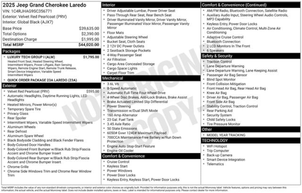2025 Jeep Grand Cherokee Laredo Velvet Red Pearlcoat Laredo 3.6L V6 24V VVT 8-Speed Automatic 4WD 19/26 City/Highway MPG