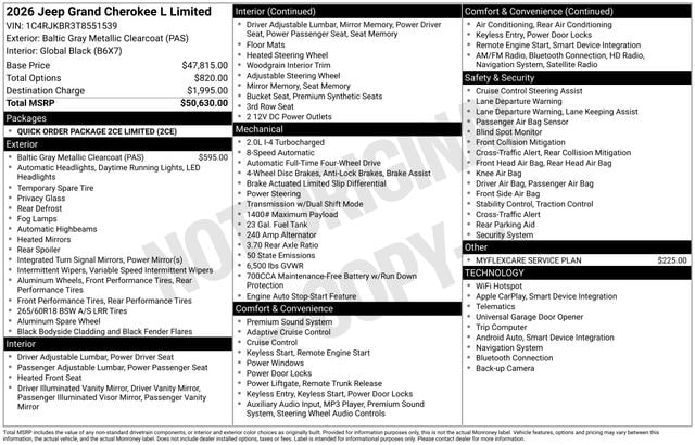 Check out all the standard equipment Quick Order Package 2CE Limited, 10 Speakers, 3.70 Rear Axle Ratio, 3rd row seats: split-bench, 4-Wheel Disc Brakes, 4G LTE Wi-Fi Hot Spot, ABS brakes, Active Noise Control System, Air Conditioning, Alloy wheels, AM/FM radio: SiriusXM with 360L, Anti-whiplash front head restraints, Apple CarPlay, AppLink/Apple CarPlay and Android Auto, Audio memory, Auto High-beam Headlights, Automatic temperature control, Brake assist, Bumpers: body-color, Capri Leatherette Seats, Compass, Connectivity - US/Canada, Delay-off headlights, Disassociated Touchscreen Display, Driver door bin, Driver vanity mirror, Dual front impact airbags, Dual front side impact airbags, Electronic Stability Control, Emergency communication system, For Details, Visit DriveUconnect.com, Four wheel independent suspension, Front anti-roll bar, Front Bucket Seats, Front Center Armrest w/Storage, Front dual zone A/C, Front fog lights, Front reading lights, Fully automatic headlights, Garage door transmitter, Global Telematics Box Module (TBM), Gloss Black Exterior Mirrors, Google Android Auto, GPS Antenna Input, Heated door mirrors, Heated Exterior Mirrors, Heated front seats, Heated rear seats, Heated steering wheel, Illuminated entry, Integrated Center Stack Radio, Integrated Voice Command with Bluetooth, Knee airbag, Low tire pressure warning, Manual Fold Seatbacks, Manual Folding Exterior Mirrors, Memory seat, MyFlexCare Service Plan, Navigation System, Normal Duty Suspension, Occupant sensing airbag, Outside temperature display, Overhead airbag, Overhead console, Panic alarm, ParkView Rear Back-Up Camera, Passenger door bin, Passenger vanity mirror, Power door mirrors, Power driver seat, Power Fold Seatbacks, Power Liftgate, Power passenger seat, Power steering, Power windows, Radio data system, Radio: Uconnect 5 Nav with 12.3" Display, Rear air conditioning, Rear anti-roll bar, Rear reading lights, Rear window defroster, Rear window wiper, Reclining 3rd row seat, Remote keyless entry, Security system, Speed control, Speed-Sensitive Wipers, Split folding rear seat, Spoiler, Steering wheel mounted audio controls, Tachometer, Telescoping steering wheel, Tilt steering wheel, Traction control, Trip computer, Turn signal indicator mirrors, USB Host Flip, Variably intermittent wipers, Voltmeter, Wheels: 18" x 8.0" Polished/Painted Aluminum, and Wheels: 20" x 8.5" Machined/Painted AluminuM. Price includes: $1000 - 2026 National Stellantis Loyalty Bonus Cash . Exp. 04/30/2026 $2000 - 2026 National SFS Lease Loyalty Bonus Cash . Exp. 04/30/2026