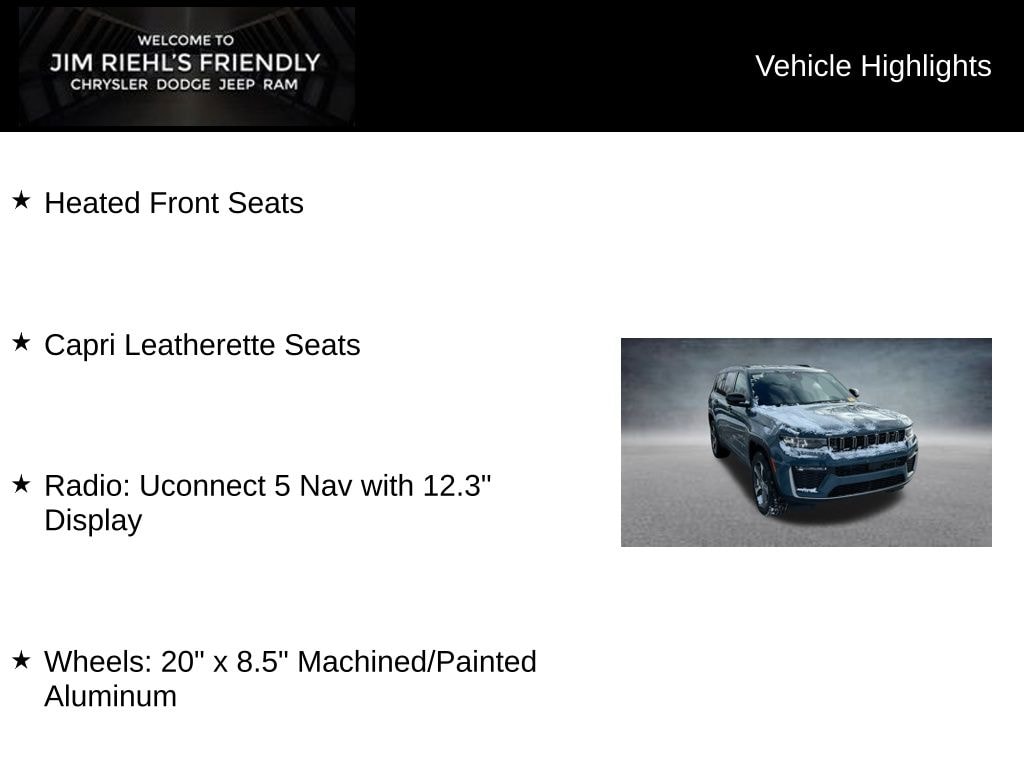 Heated Front Seats, Capri Leatherette Seats, Radio: Uconnect 5 Nav with 12.3 Display, Wheels: 20 x 8.5 Machined/Painted Aluminum.