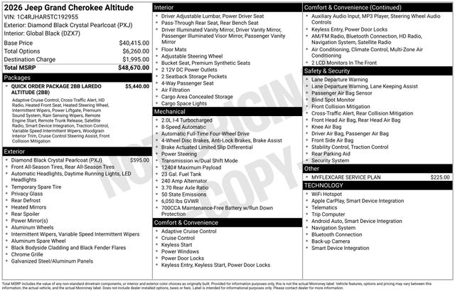 Check out all the standard equipment Laredo Altitude Appearance Package, Quick Order Package 2BB Laredo Altitude (115V Auxiliary Power Outlet, 12.3" Touchscreen Display, 240 Amp Alternator, 4G LTE Wi-Fi Hot Spot, Active Driving Assist System, Active Noise Control System, an-Teak/Satin Chrome Interior Accents, Apple CarPlay, Black Headliner, Body Color Door Handles (B), Capri Leatherette/Suede Seats, Connected Travel and Traffic Services, Connectivity - US/Canada, Delete Laredo Badge, Disassociated Touchscreen Display, Dual Exhaust Tips, Exterior Accents Dark Neutral Metallic, For Details, Visit DriveUconnect.com, Front Fascia Upper A, Global Telematics Box Module (TBM), Google Android Auto, GPS Antenna Input, GPS Navigation, HD Radio, Heated Front Seats, Heated Steering Wheel, Heavy-Duty Engine Cooling, Integrated Center Stack Radio, Integrated Voice Command with Bluetooth, Intersection Collision Assist System, Power Liftgate, Radio: Uconnect 5 Nav with 12.3" Display, Rain Sensitive Windshield Wipers, Rear Fascia Upper A, Remote Start System, Secondary Active Grille Shutters, Selec-Terrain System, Selectable Tire Fill Alert, SiriusXM with 360L, Traffic Sign Recognition, USB Host Flip, Wheels: 18" x 8.0" Fully Painted Aluminum 1, and Wireless Charging Pad), 4WD, 4-Wheel Disc Brakes, 6 Speakers, ABS brakes, Air Conditioning, Alloy wheels, AM/FM radio: SiriusXM, Anti-whiplash front head restraints, AppLink/Apple CarPlay and Android Auto, Automatic temperature control, Auxiliary Battery, Brake assist, Bumpers: body-color, Cloth Seats, Compass, Delay-off headlights, Driver door bin, Driver vanity mirror, Dual front impact airbags, Dual front side impact airbags, Electronic Stability Control, Emergency communication system, Four wheel independent suspension, Front anti-roll bar, Front Bucket Seats, Front Center Armrest w/Storage, Front dual zone A/C, Front reading lights, Fully automatic headlights, Gloss Black Exterior Mirrors, Heated door mirrors, Heated Exterior Mirrors, Illuminated entry, Knee airbag, Low tire pressure warning, Manual Folding Exterior Mirrors, MyFlexCare Service Plan, Normal Duty Suspension, Occupant sensing airbag, Outside temperature display, Overhead airbag, Overhead console, Panic alarm, ParkView Rear Back-Up Camera, Passenger door bin, Passenger vanity mirror, Power door mirrors, Power driver seat, Power steering, Power windows, Radio data system, Radio: Uconnect 5 with 8.4" Display, Rear anti-roll bar, Rear reading lights, Rear window defroster, Rear window wiper, Remote keyless entry, Security system, Speed control, Speed-Sensitive Wipers, Split folding rear seat, Spoiler, Steering wheel mounted audio controls, Tachometer, Telescoping steering wheel, Tilt steering wheel, Traction control, Trip computer, Variably intermittent wipers, Voltmeter, and Wheels: 18" x 8.0" Fully Painted Alum Price includes: $1000 - 2026 National Stellantis Loyalty Bonus Cash . Exp. 03/31/2026 $2000 - 2026 National SFS Lease Loyalty Bonus C