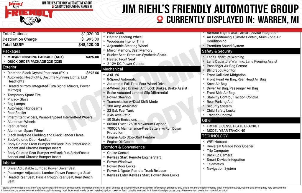 Check out all the standard equipment MOPAR Finishing Package (MOPAR Front Splash Guards, MOPAR Paint Protection Film, and MOPAR Rear Splash Guards with Jeep Logo), Quick Order Package 22E, 4-Wheel Disc Brakes, 6 Speakers, ABS brakes, Active Noise Control System, Air Conditioning, Alloy wheels, AM/FM radio: SiriusXM with 360L, Anti-whiplash front head restraints, Audio memory, Auto High-beam Headlights, Automatic temperature control, Brake assist, Bumpers: body-color, Capri Leatherette Seats, Compass, Delay-off headlights, Driver door bin, Driver vanity mirror, Dual front impact airbags, Dual front side impact airbags, Electronic Stability Control, Emergency communication system, Four wheel independent suspension, Front anti-roll bar, Front Bucket Seats, Front Center Armrest w/Storage, Front dual zone A/C, Front fog lights, Front License Plate Bracket, Front reading lights, Fully automatic headlights, Garage door transmitter, Heated door mirrors, Heated front seats, Heated rear seats, Heated steering wheel, Illuminated entry, Knee airbag, Low tire pressure warning, Memory seat, Model Year Tracking, Navigation System, Normal Duty Suspension, Occupant sensing airbag, Outside temperature display, Overhead airbag, Overhead console, Panic alarm, ParkView Rear Back-Up Camera, Passenger door bin, Passenger vanity mirror, Power door mirrors, Power driver seat, Power Liftgate, Power passenger seat, Power steering, Power windows, Radio data system, Radio: Uconnect 5 Nav with 10.1 Display, Rear anti-roll bar, Rear reading lights, Rear window defroster, Rear window wiper, Remote keyless entry, Security system, Speed control, Speed-Sensitive Wipers, Split folding rear seat, Spoiler, Steering wheel mounted audio controls, Tachometer, Telescoping steering wheel, Tilt steering wheel, Traction control, Trip computer, Turn signal indicator mirrors, Variably intermittent wipers, Voltmeter, and Wheels: 18 x 8 Polished/Painted Aluminum. Must qualify for FCA Employee Discount, Price includes: $1500 - 2025 National Stellantis Loyalty Retail Bonus Cash . Exp. 01/05/2026 $2250 - 2025 National Retail Bonus Cash . Exp. 01/05/2026