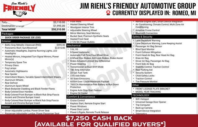 Check out all the standard equipment Quick Order Package 22E, 4WD, 4-Wheel Disc Brakes, 6 Speakers, ABS brakes, Active Noise Control System, Air Conditioning, Alloy wheels, AM/FM radio: SiriusXM with 360L, Anti-whiplash front head restraints, Audio memory, Auto High-beam Headlights, Automatic temperature control, Brake assist, Bumpers: body-color, Capri Leatherette Seats, Compass, Delay-off headlights, Driver door bin, Driver vanity mirror, Dual front impact airbags, Dual front side impact airbags, Dual-Pane Panoramic Sunroof, Electronic Stability Control, Emergency communication system, Four wheel independent suspension, Front anti-roll bar, Front Bucket Seats, Front Center Armrest w/Storage, Front dual zone A/C, Front fog lights, Front License Plate Bracket, Front reading lights, Fully automatic headlights, Garage door transmitter, Heated door mirrors, Heated front seats, Heated rear seats, Heated steering wheel, Illuminated entry, Knee airbag, Low tire pressure warning, Memory seat, Model Year Tracking, Navigation System, Normal Duty Suspension, Occupant sensing airbag, Outside temperature display, Overhead airbag, Overhead console, Panic alarm, ParkView Rear Back-Up Camera, Passenger door bin, Passenger vanity mirror, Power door mirrors, Power driver seat, Power Liftgate, Power passenger seat, Power steering, Power windows, Radio data system, Radio: Uconnect 5 Nav with 10.1" Display, Rear anti-roll bar, Rear reading lights, Rear window defroster, Rear window wiper, Remote keyless entry, Security system, Speed control, Speed-Sensitive Wipers, Split folding rear seat, Spoiler, Steering wheel mounted audio controls, Tachometer, Telescoping steering wheel, Tilt steering wheel, Traction control, Trip computer, Turn signal indicator mirrors, Variably intermittent wipers, Voltmeter, and Wheels: 18" x 8" Polished/Painted Aluminum. Price includes: $1000 - 2025 National Stellantis Loyalty Bonus Cash . Exp. 04/30/2026 $2000 - 2025 National Bonus Cash . Exp. 04/30/2026 $2000 - 2025 National SFS Lease Loyalty Bonus Cash. Exp. 04/30/2026 $2250 - 2025 National Retail Bonus Cash . Exp. 04/30/2026