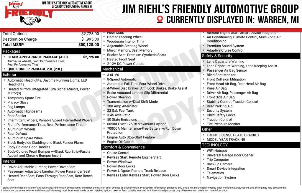 Check out all the standard equipment Black Appearance Package (Gloss Black Exterior Accents and Wheels: 20 x 8.5 Gloss Black Painted Aluminum), Quick Order Package 23E, 4-Wheel Disc Brakes, 6 Speakers, ABS brakes, Active Noise Control System, Air Conditioning, Alloy wheels, AM/FM radio: SiriusXM with 360L, Anti-whiplash front head restraints, Audio memory, Auto High-beam Headlights, Automatic temperature control, Brake assist, Bumpers: body-color, Capri Leatherette Seats, Compass, Delay-off headlights, Driver door bin, Driver vanity mirror, Dual front impact airbags, Dual front side impact airbags, Electronic Stability Control, Emergency communication system, Four wheel independent suspension, Front anti-roll bar, Front Bucket Seats, Front Center Armrest w/Storage, Front dual zone A/C, Front fog lights, Front License Plate Bracket, Front reading lights, Fully automatic headlights, Garage door transmitter, Heated door mirrors, Heated front seats, Heated rear seats, Heated steering wheel, Illuminated entry, Knee airbag, Low tire pressure warning, Memory seat, Model Year Tracking, Navigation System, Normal Duty Suspension, Occupant sensing airbag, Outside temperature display, Overhead airbag, Overhead console, Panic alarm, ParkView Rear Back-Up Camera, Passenger door bin, Passenger vanity mirror, Power door mirrors, Power driver seat, Power Liftgate, Power passenger seat, Power steering, Power windows, Radio data system, Radio: Uconnect 5 Nav with 10.1 Display, Rear anti-roll bar, Rear reading lights, Rear window defroster, Rear window wiper, Remote keyless entry, Security system, Speed control, Speed-Sensitive Wipers, Split folding rear seat, Spoiler, Steering wheel mounted audio controls, Tachometer, Telescoping steering wheel, Tilt steering wheel, Traction control, Trip computer, Turn signal indicator mirrors, Variably intermittent wipers, Voltmeter, and Wheels: 18 x 8 Polished/Painted Aluminum. Must qualify for FCA Employee Discount, Price includes: $1500 - 2025 National Stellantis Loyalty Retail Bonus Cash . Exp. 01/05/2026 $2250 - 2025 National Retail Bonus Cash . Exp. 01/05/2026