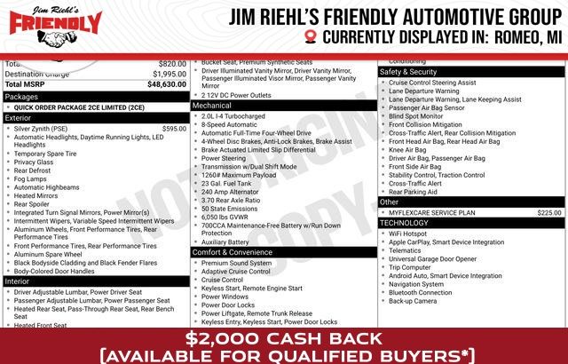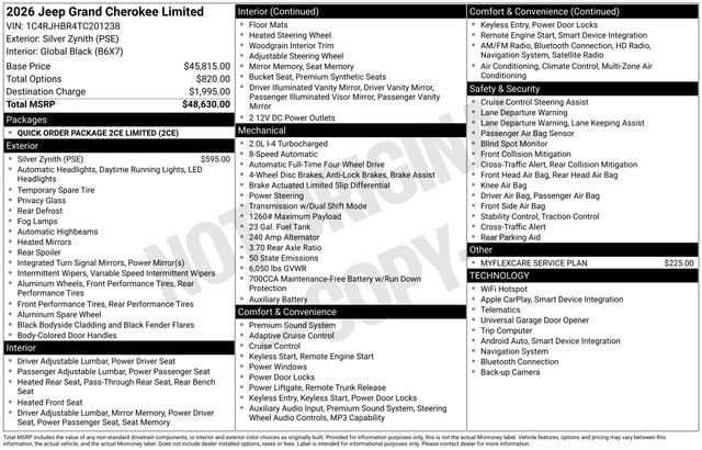 Check out all the standard equipment Quick Order Package 2CE Limited, 4WD, 10 Speakers, 3.70 Rear Axle Ratio, 4-Wheel Disc Brakes, 4G LTE Wi-Fi Hot Spot, ABS brakes, Active Noise Control System, Air Conditioning, Alloy wheels, AM/FM radio: SiriusXM with 360L, Anti-whiplash front head restraints, Apple CarPlay, AppLink/Apple CarPlay and Android Auto, Audio memory, Auto High-beam Headlights, Automatic temperature control, Auxiliary Battery, Brake assist, Bumpers: body-color, Capri Leatherette Seats, Compass, Connectivity - US/Canada, Delay-off headlights, Disassociated Touchscreen Display, Driver door bin, Driver vanity mirror, Dual front impact airbags, Dual front side impact airbags, Electronic Stability Control, Emergency communication system, For Details, Visit DriveUconnect.com, Four wheel independent suspension, Front anti-roll bar, Front Bucket Seats, Front Center Armrest w/Storage, Front dual zone A/C, Front fog lights, Front reading lights, Fully automatic headlights, Garage door transmitter, Global Telematics Box Module (TBM), Gloss Black Exterior Mirrors, Google Android Auto, GPS Antenna Input, Heated door mirrors, Heated Exterior Mirrors, Heated front seats, Heated rear seats, Heated steering wheel, Illuminated entry, Integrated Center Stack Radio, Integrated Voice Command with Bluetooth, Knee airbag, Low tire pressure warning, Manual Folding Exterior Mirrors, Memory seat, MyFlexCare Service Plan, Navigation System, Normal Duty Suspension, Occupant sensing airbag, Outside temperature display, Overhead airbag, Overhead console, Panic alarm, ParkView Rear Back-Up Camera, Passenger door bin, Passenger vanity mirror, Power door mirrors, Power driver seat, Power Liftgate, Power passenger seat, Power steering, Power windows, Radio data system, Radio: Uconnect 5 Nav with 12.3" Display, Rear anti-roll bar, Rear reading lights, Rear window defroster, Rear window wiper, Remote keyless entry, Security system, Speed control, Speed-Sensitive Wipers, Split folding rear seat, Spoiler, Steering wheel mounted audio controls, Tachometer, Telescoping steering wheel, Tilt steering wheel, Traction control, Trip computer, Turn signal indicator mirrors, USB Host Flip, Variably intermittent wipers, Voltmeter, Wheels: 18" x 8.0" Polished/Painted Aluminum, and Wheels: 20" x 8.5" Machined/Painted AluminuM. Price includes: $1500 - 2026 National Retail Bonus Cash . Exp. 04/30/2026 $500 - 2026 Great Lakes BC Bonus Cash . Exp. 04/30/2026