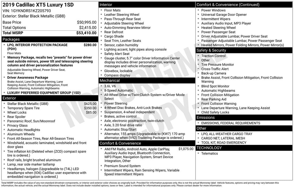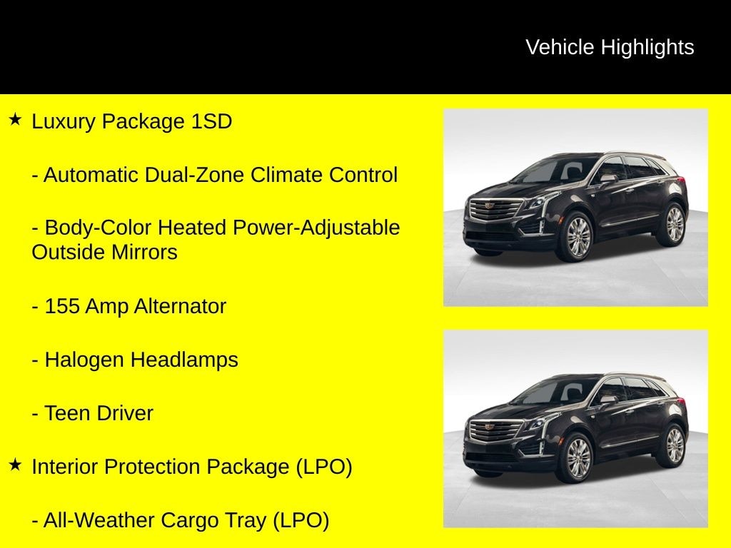 XT5 Luxury, 3.6L V6 DI VVT, 8-Speed Automatic, AWD, 155 Amp Alternator, All-Weather Cargo Tray (LPO), All-Weather Floor Mats, Auto High-beam Headlights, Automatic Dual-Zone Climate Control, Body-Color Heated Power-Adjustable Outside Mirrors, Brake assist, Delay-off headlights, Dual front impact airbags, Dual front side impact airbags, Electronic Stability Control, Emergency communication system: OnStar and Cadillac connected services capable, Exterior Parking Camera Rear, Front anti-roll bar, Front Bucket Seats, Front Center Armrest, Front dual zone A/C, Fully automatic headlights, Halogen Headlamps, Heated front seats, Interior Protection Package (LPO), Knee airbag, Lateral Mesh Cargo Net, Luxury Package 1SD, Panic alarm, Passenger door bin, Power driver seat, Power Liftgate, Power moonroof: UltraView, Power steering, Power windows, Rain sensing wipers, Rear window defroster, Rear window wiper, Remote keyless entry, Road Emergency Tool Kit, Speed control, Steering wheel memory, Steering wheel mounted audio controls, Teen Driver.