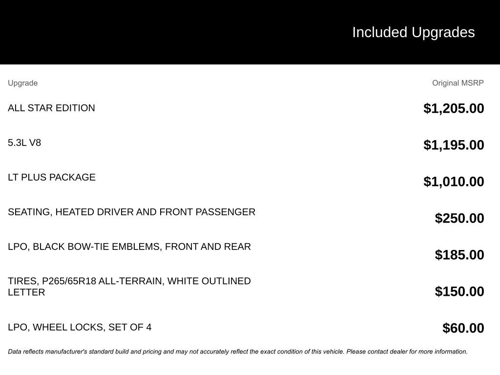 Odometer is 30783 miles below market average! EcoTec3 5.3L V8, 6-Speed Automatic Electronic with Overdrive, 4WD, 110-Volt AC Power Outlet, All Star Edition, Brake assist, Deep-Tinted Glass, Delay-off headlights, Dual-Zone Automatic Climate Control, Electric Rear-Window Defogger, Electronic Stability Control, Emergency communication system: OnStar Guidance, Exterior Parking Camera Rear, Front anti-roll bar, Front wheel independent suspension, Fully automatic headlights, Heavy-Duty Rear Locking Differential, High-Intensity Discharge Headlights, Leather Wrapped Steering Wheel w/Cruise Controls, Low tire pressure warning, LT Plus Package, Occupant sensing airbag, Panic alarm, Power Adjustable Pedals, Power door mirrors, Power Sliding Rear Window, Power steering, Power windows, Power Windows w/Driver Express Up, Rear step bumper, Rear Vision Camera, Rear Wheelhouse Liners, Remote Vehicle Starter System, Speed control, Speed-sensing steering, Theft Deterrent System (Unauthorized Entry), Traction control, Ultrasonic Rear Park Assist, Universal Home Remote, Variably intermittent wipers.