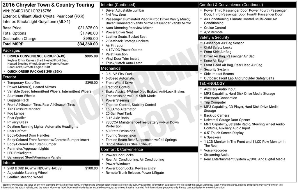 2016 Chrysler Town & Country Touring Brilliant Black Crystal Pearlcoat 3.6L 6-Cylinder SMPI Flex Fuel DOHC 6-Speed Automatic