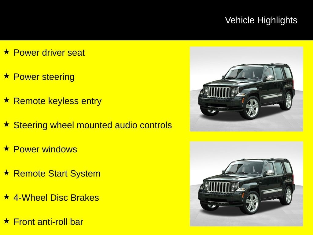 CARFAX One-Owner. Odometer is 65196 miles below market average! Liberty Limited Jet Edition, PowerTech 3.7L V6, 4WD, Dark Slate Gray Interior Leather, 4-Wheel Disc Brakes, ABS brakes, Air Conditioning, Air Conditioning w/Auto Temperature Control, Anti-whiplash front head restraints, Brake assist, Comfort/Convenience Group, Delay-off headlights, Driver door bin, Dual front impact airbags, Electronic Stability Control, Front anti-roll bar, Front Bucket Seats, Front Center Armrest, Front fog lights, Front reading lights, Front wheel independent suspension, Fully automatic headlights, Heated front seats, Leather Trimmed Bucket Seats, Low tire pressure warning, Memory seat, Occupant sensing airbag, Power driver seat, Power steering, Power windows, Quick Order Package 28T Jet (DISC), Rear window defroster, Rear window wiper, Remote keyless entry, Remote Start System, Steering wheel mounted audio controls, Tachometer, Tilt steering wheel, Trip computer, Variably intermittent wipers.
