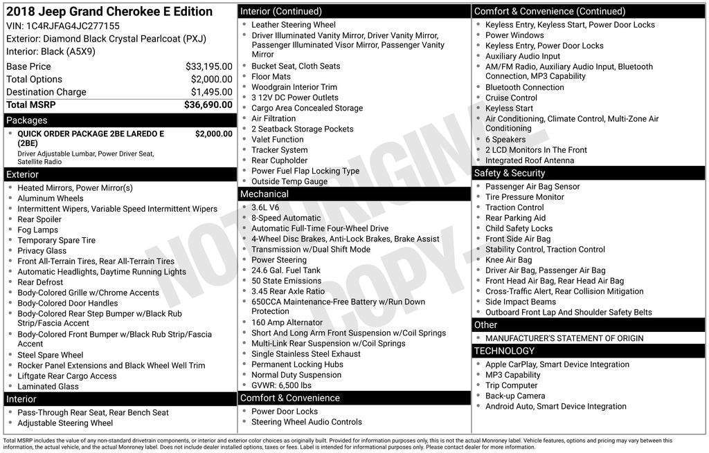 2018 Jeep Grand Cherokee Laredo Diamond Black Crystal Pearlcoat 3.6L V6 24V VVT 8-Speed Automatic