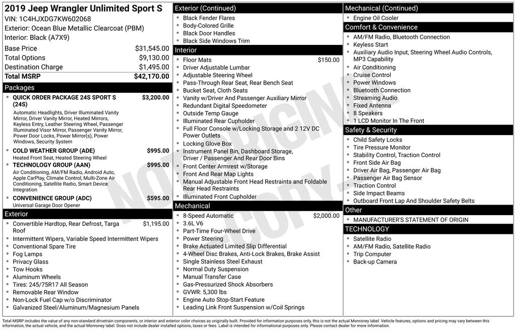 Wrangler Unlimited Sport S, 3.6L V6 24V VVT, 8-Speed Automatic, 4WD, 7.0 Touchscreen Display, Air Conditioning w/Auto Temperature Control, Air Filtering, Apple CarPlay, Automatic Headlamps, Brake assist, Cluster 7.0 TFT Color Display, Cold Weather Group, Convenience Group, Deep Tint Sunscreen Windows, Delay-off headlights, Dual front impact airbags, Dual front side impact airbags, Electronic Stability Control, Front 1-Touch Down Power Windows, Front anti-roll bar, Front fog lights, Google Android Auto, GPS Antenna Input, Heated Front Seats, Heated Steering Wheel, Integrated Center Stack Radio, Integrated roll-over protection, Leather Wrapped Steering Wheel, Low tire pressure warning, Occupant sensing airbag, ParkView Rear Back-Up Camera, Power Heated Mirrors, Quick Order Package 24S Sport S, Radio: Uconnect 4 w/7 Display, Rear anti-roll bar, Rear Window Wiper/Washer, Remote Keyless Entry, Security Alarm, SiriusXM Satellite Radio, Speed control, Speed Sensitive Power Locks, Sun Visors w/Illuminated Vanity Mirrors, Technology Group, Universal Garage Door Opener, USB Host Flip, Variably intermittent wipers, Wheels: 17 x 7.5 Tech Silver Aluminum.