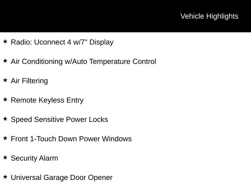 - Wireless phone connectivity: Uconnect w/Bluetooth