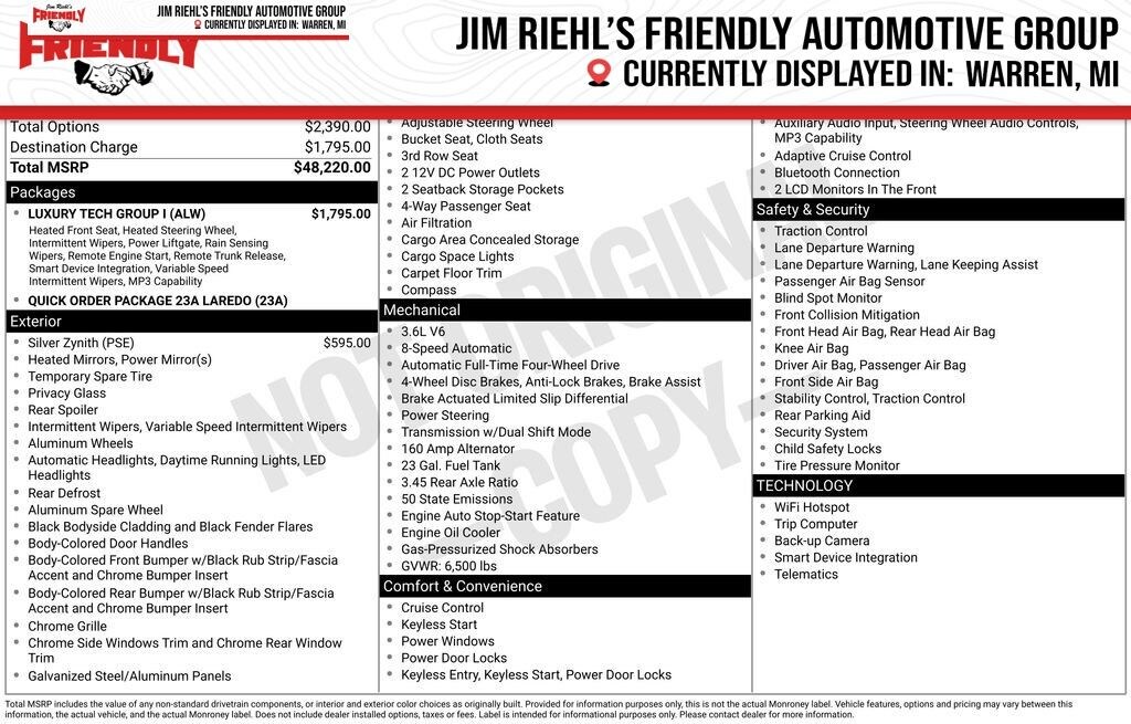 CARFAX One-Owner. Clean CARFAX. Odometer is 22351 miles below market average! 3.6L V6 24V VVT, 8-Speed Automatic, 4WD, 115V Auxiliary Power Outlet, 3rd Row Charge-Only USB Ports, 4-Wheel Disc Brakes, ABS brakes, Air Conditioning, Anti-whiplash front head restraints, Automatic temperature control, Brake assist, Delay-off headlights, Electronic Stability Control, Front anti-roll bar, Front Center Armrest w/Storage, Front dual zone A/C, Fully automatic headlights, Heated Front Seats, Heated Steering Wheel, Knee airbag, Low tire pressure warning, Luxury Tech Group I, Molded In Color Black/Gloss Black Roof Rails, Occupant sensing airbag, Overhead airbag, Panic alarm, ParkView Rear Back-Up Camera, Power driver seat, Power Liftgate, Power steering, Power windows, Quick Order Package 23A Laredo, Rain Sensitive Windshield Wipers, Rear air conditioning, Rear window defroster, Rear window wiper, Remote keyless entry, Remote Start System, Security system, Selectable Tire Fill Alert, Speed control, Speed-Sensitive Wipers, Steering wheel mounted audio controls, Variably intermittent wipers, Wireless Charging Pad.