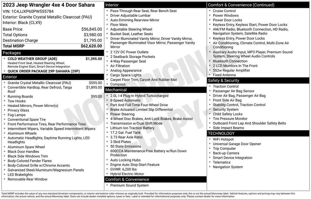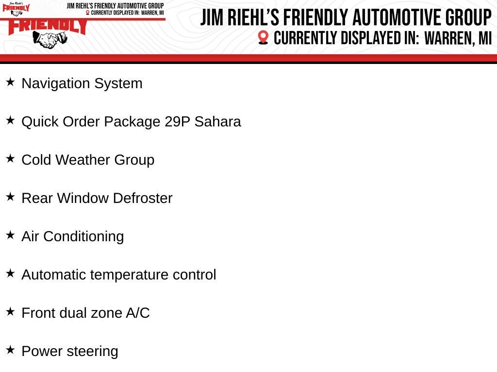 CARFAX One-Owner. Wrangler Sahara 4xe, 8-Speed Automatic, 4WD, Air Conditioning, Automatic temperature control, Brake assist, Cold Weather Group, Delay-off headlights, Dual front impact airbags, Dual front side impact airbags, Electronic Stability Control, Emergency communication system: SiriusXM Guardian, Freedom Panel Storage Bag, Front anti-roll bar, Front Center Armrest w/Storage, Front dual zone A/C, Front fog lights, Fully automatic headlights, Heated Front Seats, Heated Steering Wheel, Integrated roll-over protection, Low tire pressure warning, Navigation System, Occupant sensing airbag, Panic alarm, ParkView Rear Back-Up Camera, Passenger door bin, Power steering, Power windows, Quick Order Package 29P Sahara, Rear anti-roll bar, Rear Window Defroster, Rear Window Wiper/Washer, Remote keyless entry, Remote Start System, Security system, Side Steps, Speed control, Steering wheel mounted audio controls, Variably intermittent wipers.