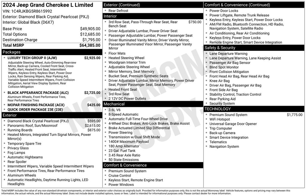 Boasting an impressive array of premium features, this Grand Cherokee L Limited stands out from the crowd. Key highlights include the - Black Appearance Package, Luxury Tech Group II, Dual Pane Panoramic Sunroof, 9 Amplified Speakers with Subwoofer, and MOPAR Finishing Package. These thoughtful additions elevate the vehicle's style, convenience, and entertainment, ensuring you enjoy every mile.