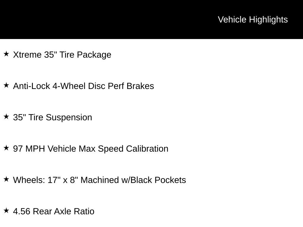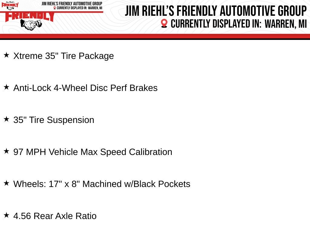 CARFAX One-Owner. Clean CARFAX. Wrangler Rubicon, 8-Speed Automatic, 4WD, 35 Tire Suspension, 4.56 Rear Axle Ratio, 97 MPH Vehicle Max Speed Calibration, Anti-Lock 4-Wheel Disc Perf Brakes, Wheels: 17 x 8 Machined w/Black Pockets, Xtreme 35 Tire Package.