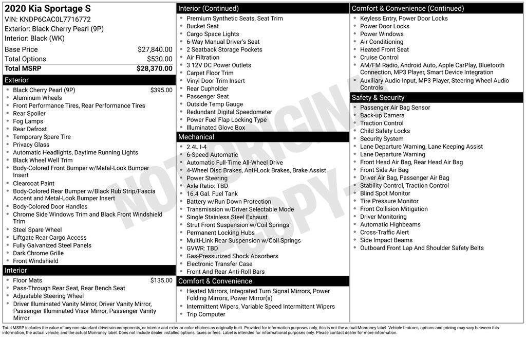 2020 Kia Sportage S Black Cherry Pearl 2.4L I4 DGI DOHC 16V 6-Speed Automatic Electronic with Overdrive