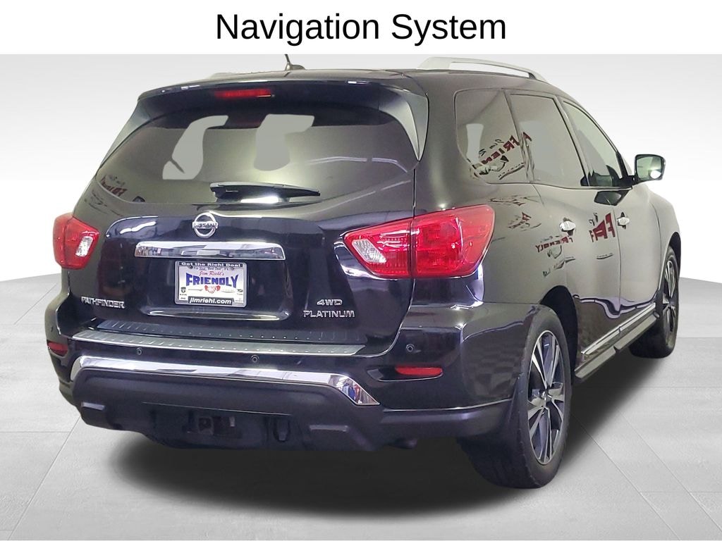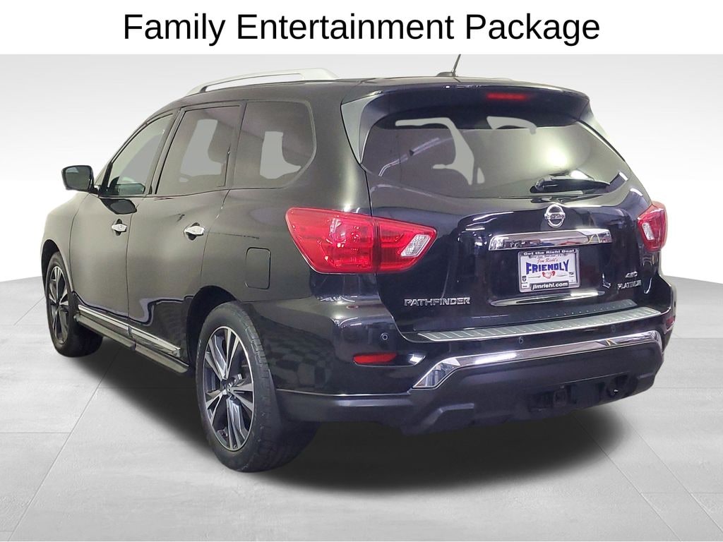 CARFAX One-Owner. Pathfinder Platinum, V6, 4WD, 13 Speakers, 3rd row seats: bench, Air Conditioning, AM/FM radio: SiriusXM, Auto tilt-away steering wheel, Auto-dimming Rear-View mirror, Automatic temperature control, Blind Spot Warning, Brake assist, Carpeted Floor Mats (4-pc Set), CD player, Delay-off headlights, Driver door bin, Driver vanity mirror, Dual 8 Headrest DVD FES, Dual front impact airbags, Dual front side impact airbags, Electronic Stability Control, Emergency communication system: NissanConnect Services, Family Entertainment Package, Four wheel independent suspension, Front anti-roll bar, Front Bucket Seats, Front dual zone A/C, Front fog lights, Front Heated & Cooled Bucket Seats, Fully automatic headlights, Heated front seats, Heated rear seats, Leather Seating Surfaces, Low tire pressure warning, Memory seat, Navigation System, Occupant sensing airbag, Outside temperature display, Overhead console, Panic alarm, Passenger vanity mirror, Power driver seat, Power Liftgate, Power moonroof, Power passenger seat, Power steering, Power windows, Radio data system, Radio: Bose Premium Audio w/AM/FM/CD & 13 Speakers, Rear air conditioning, Rear Bumper Protector, Rear Parking Sensors, Rear reading lights, Rear seat center armrest, Rear window defroster, Rear window wiper, Reclining 3rd row seat, Remote keyless entry, Security system, Speed-sensing steering, Speed-Sensitive Wipers, Steering wheel memory, Steering wheel mounted audio controls, Traction control, Variably intermittent wipers. 19/26 City/Highway MPG