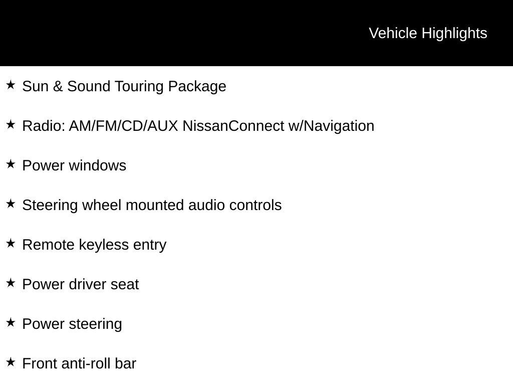 - Radio: AM/FM/CD/AUX NissanConnect w/Navigation