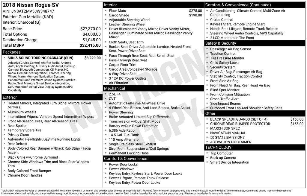 The advertised price does not include sales tax, vehicle registration fees, other fees required by law, finance charges and a $280 documentation Fee and $299 Reconditioning Fee . * Images, prices, and options shown, including vehicle color, trim, options, pricing and other specifications are subject to availability, incentive offerings, current pricing and credit worthiness.