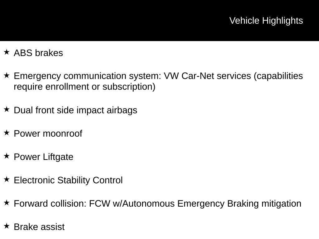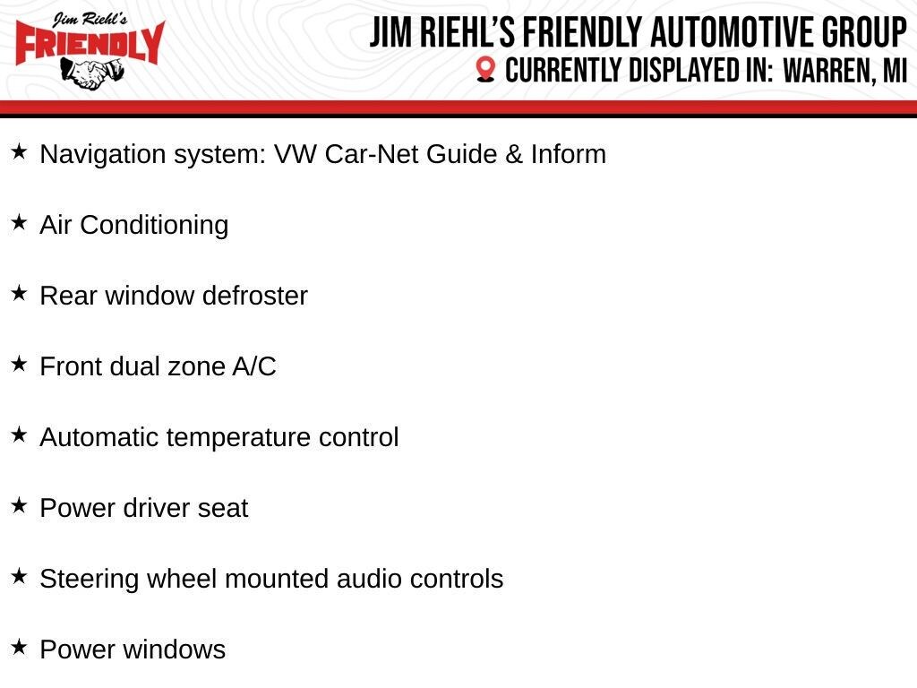 Clean CARFAX. Priced below KBB Fair Purchase Price! Odometer is 15408 miles below market average! 8-Speed Automatic with Tiptronic, AWD, 4-Wheel Disc Brakes, 4-Wheel Independent Suspension, ABS brakes, Air Conditioning, Auto-dimming Rear-View mirror, Automatic temperature control, Brake assist, Delay-off headlights, Driver door bin, Driver vanity mirror, Dual front impact airbags, Dual front side impact airbags, Electronic Stability Control, Emergency communication system: VW Car-Net services (capabilities require enrollment or subscription), Exterior Parking Camera Rear, First Aid Kit, Forward collision: FCW w/Autonomous Emergency Braking mitigation, Four wheel independent suspension, Front Center Armrest, Front dual zone A/C, Front fog lights, Front reading lights, Fully automatic headlights, Heated Front Comfort Seats, Heated front seats, Heated steering wheel, Heavy Duty Trunk Liner w/VW CarGo Blocks, Illuminated entry, Navigation system: VW Car-Net Guide & Inform, Panic alarm, Perforated V-Tex Leatherette Seating Surfaces, Power driver seat, Power Liftgate, Power moonroof, Power steering, Power windows, Rain sensing wipers, Rear window defroster, Rear window wiper, Remote keyless entry, Security system, Speed-sensing steering, Steering wheel mounted audio controls, Traction control, Variably intermittent wipers. 21/27 City/Highway MPG